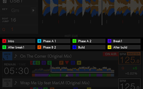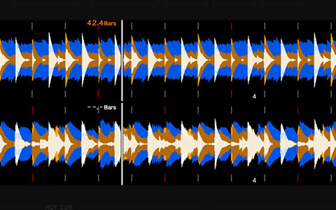 显示使用本机或rekordbox分析的乐曲放大波形、CUE点、LOOP、HOT CUE等。